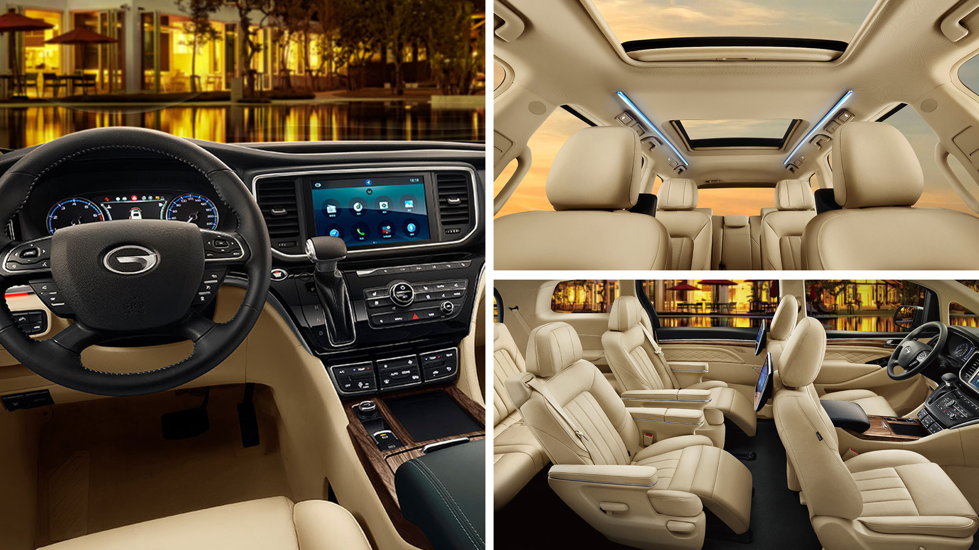 GAC GN8 имеет 3-рядную компоновку салона с 7-ю посадочными местами. Во 2-м ряду установлена пара огромных раздельных кресел с электрорегулировками (включая подставки для ног), а также функциями массажа и обогрева.