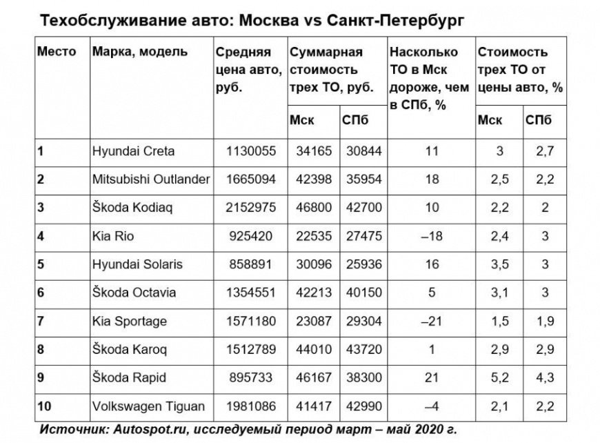 Самыми дешёвыми по обслуживанию моделями рейтинга стали: в Москве — KIA Rio X-Line (21 776 руб.) и KIA Rio (22 500 руб.), а в Санкт-Петербурге — Hyundai Solaris (25 936 рублей).