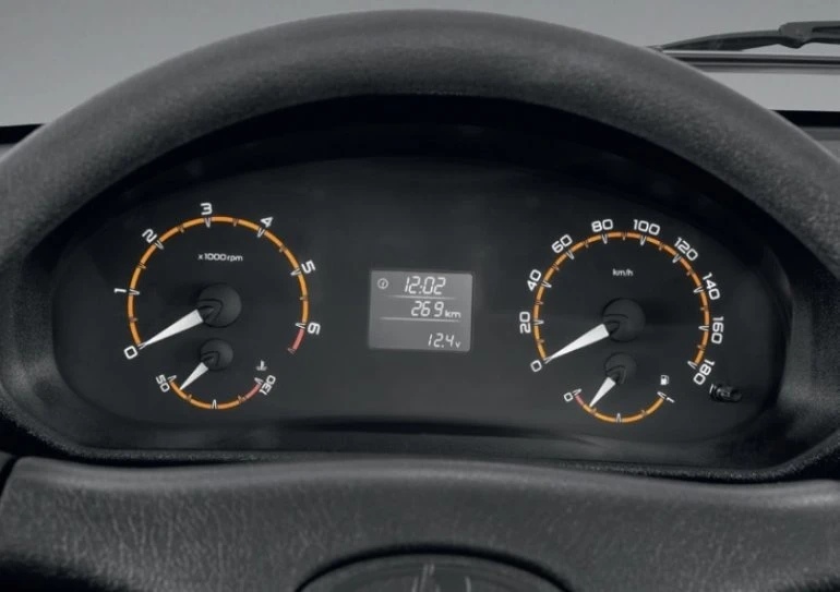 Это частично цифровая «приборка» от недавно обновлённой модели Lada 4×4. На ней размещены пару циферблатов (тахометр и указатель температуры — слева, спидометр и указатель уровня топлива — справа) и дисплей бортового компьютера между ними.