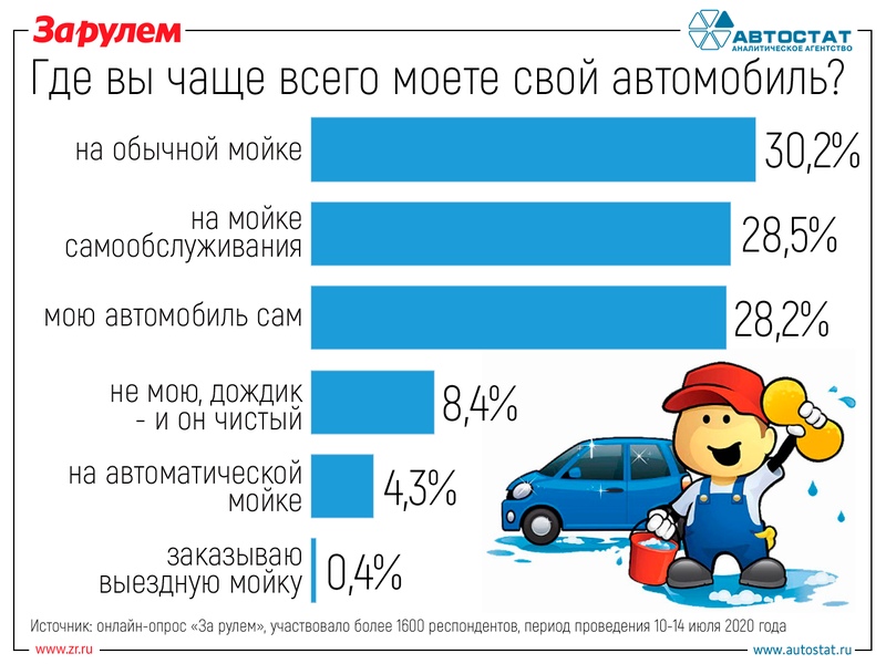 Такой информацией поделились журнал «За рулём» и аналитическое агентство «Автостат». Они провели онлайн-опрос с целью узнать, пользуются ли российские автомобилисты услугами автомоек и каких именно. Респондентами стало более 1 600 человек.