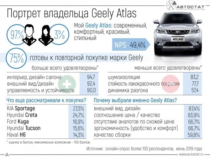 Выяснилось, что Geely Atlas покупают, в основном, мужчины — 97% респондентов. Перед покупкой они сравнивали его с такими «мэтрами» мира кроссоверов, как KIA Sportage (27%), Hyundai Creta (24,7%), Ford Kuga (16,9%) и Hyundai Tucson (15,6%), а также с весьма популярным «китайцем» Haval H6 (14,3%).