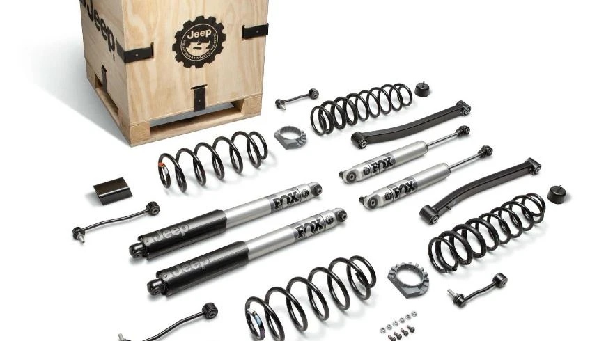 В комплект вошли 4 амортизатора Fox, 4 пружины с прогрессивными характеристиками, передние нижние рычаги управления, передние и задние тяги стабилизатора, передний и задний отбойники, а также различные крепежные элементы. Всё это упаковано в деревянный ящик с фирменной надписью Jeep.