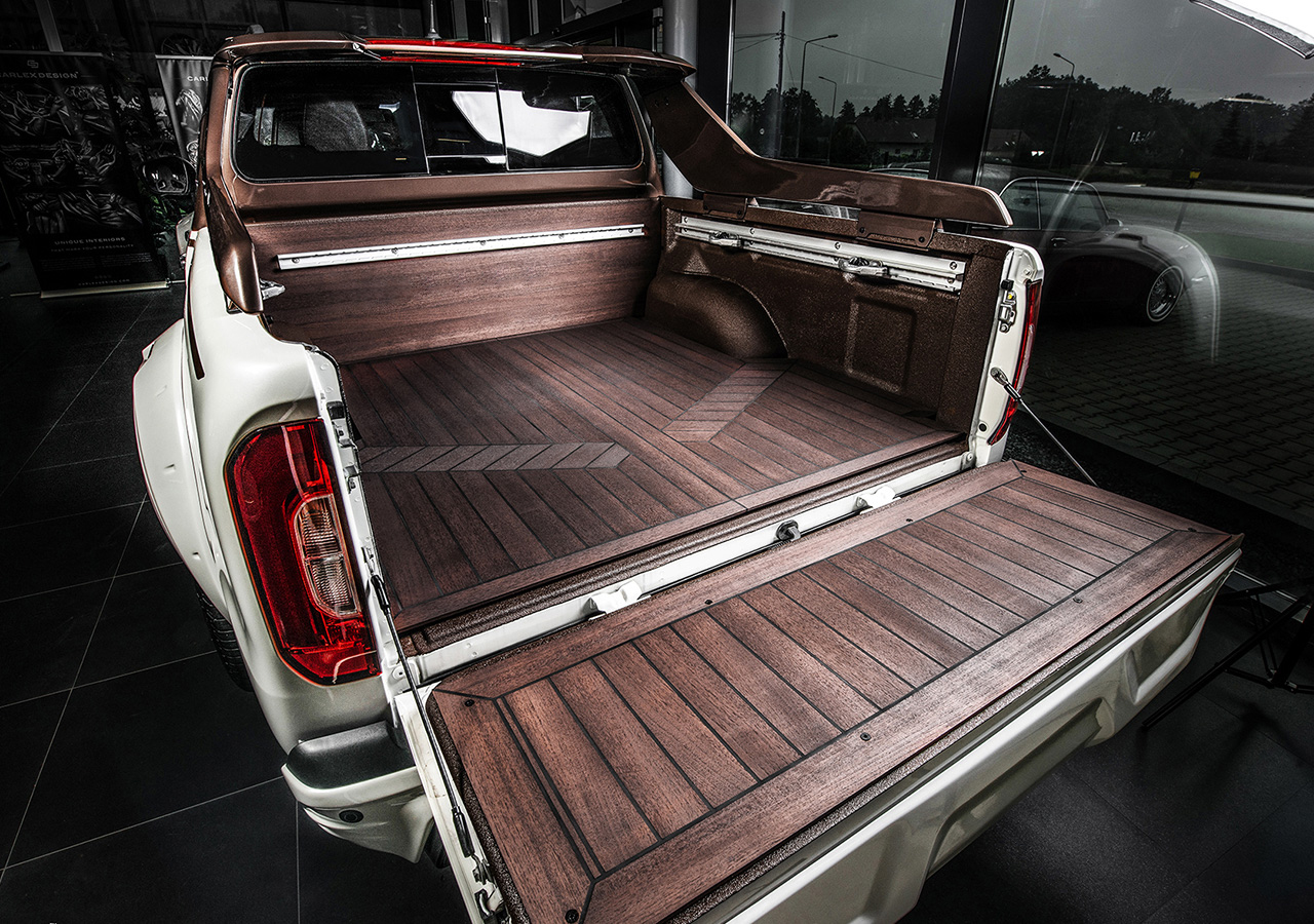 Тем же материалом отделаны рули и передняя панель пикапа, а обшивка салона выполнена из кожи и алькантары схожего с тиковым деревом оттенка. В такой же колер окрашены крыша, капот, оконные рамки, стойки кабины и дуга безопасности, которая по форме напоминает ограждения кокпитов гоночных яхт.