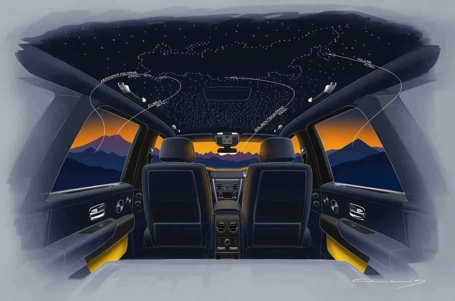 Салон каждого такого кроссовера также имеет уникальную отделку, общими элементами которой стали декоративные накладки с подсветкой на порогах и вышитые на подголовниках заснеженные горы. Потолки будут украшены фирменным «звёздным небом», выполненным в виде схематического изображения карты России.
