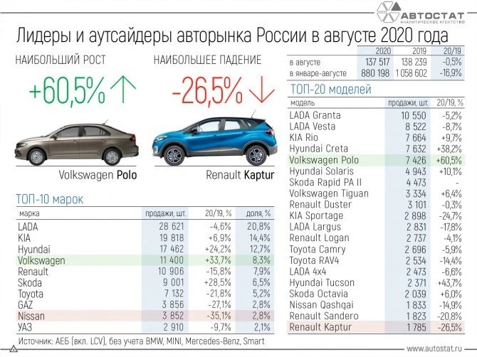 Среди марок лидером остаётся Lada — в августе был реализован 28 621 автомобиль «АвтоВАЗа». Его рыночная доля при этом составила 20,8%.