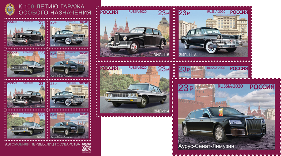 В почтовое обращение в России с 10 сентября попали новая серия марок, посвященная персональным автомобилям руководителей СССР и РФ. В их списке в том числе оказался сранвителньо недавно разработанный лимузин Aurus Senat.