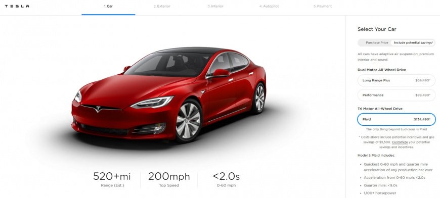 Tesla Model S Plaid будет оснащаться 3-мя электромоторами суммарной мощностью в 1 100 л. с., что сделает новинку самым быстрым серийным электромобилем в мире. По словам Илона Маска, новинка будет разгоняться до 100 км/ч за 2 сек., что на 0,5 сек. быстрее показанного недавно электроседана Lucid Air.