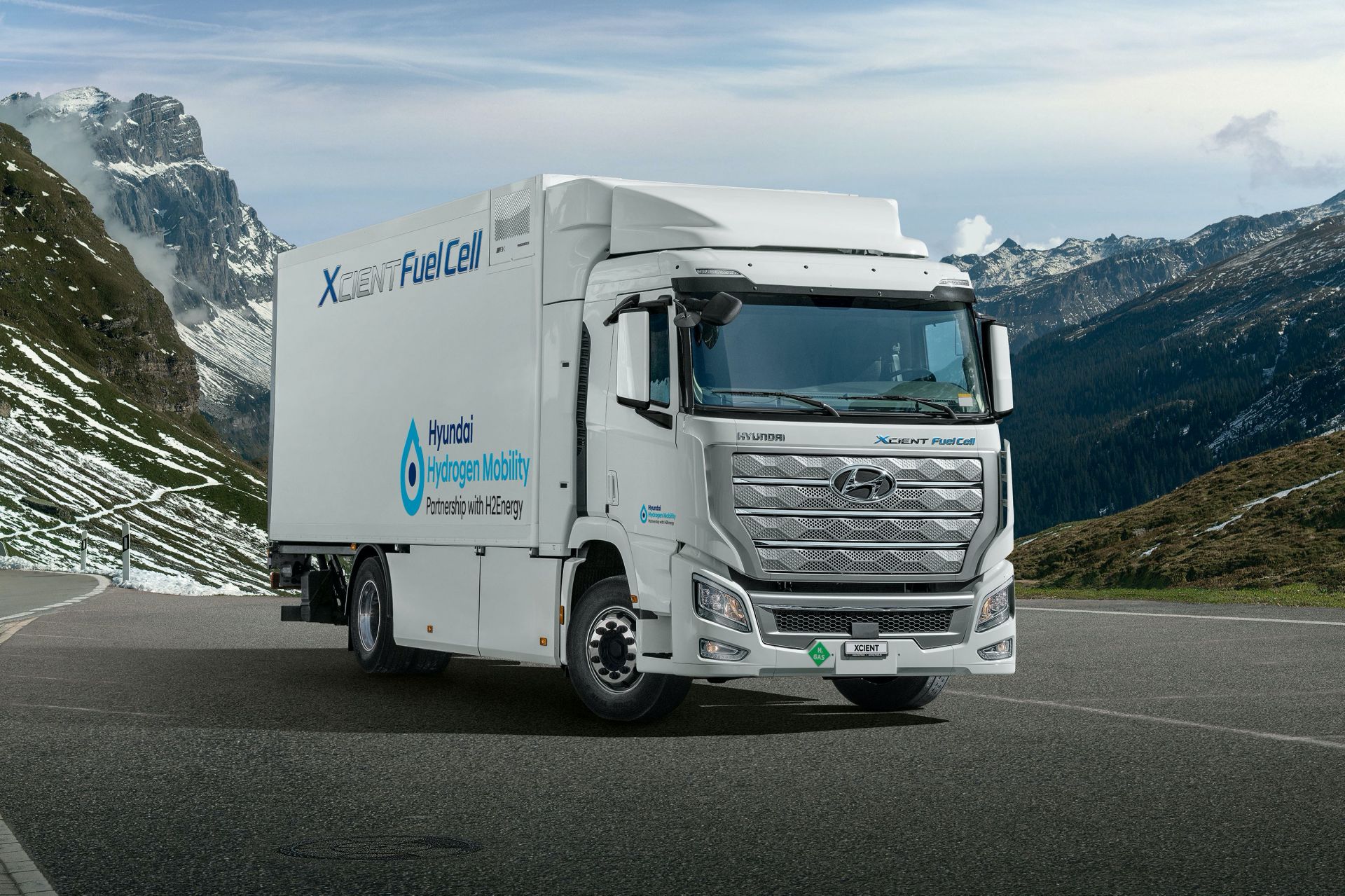 Тяжёлый электрогрузовик Hyundai Xcient, имеющий длину в 9 000 мм, развивает мощность в 255 л. с. Водород хранится в 7 баллонах вместимостью в 32 кг, чего хватает на 400 км пробега. Их полная заправка занимает от 8 до 20 мин.