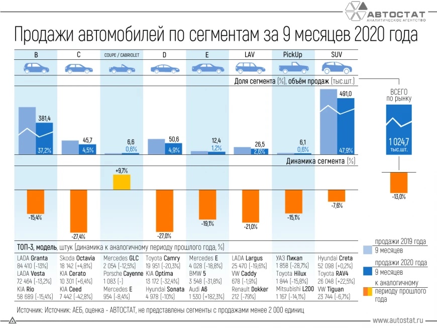 Какова динамика продаж в разных сегментах авторынка России?