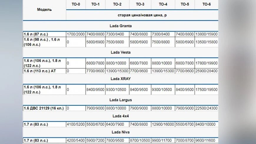 При этом для моделей Lada Vesta, Lada Largus, Lada XRay и 2-х модификаций Lada Granta первое техобслуживание осталось бесплатным. Стоимость прочих ТО для разных моделей опубликована в таблице:
