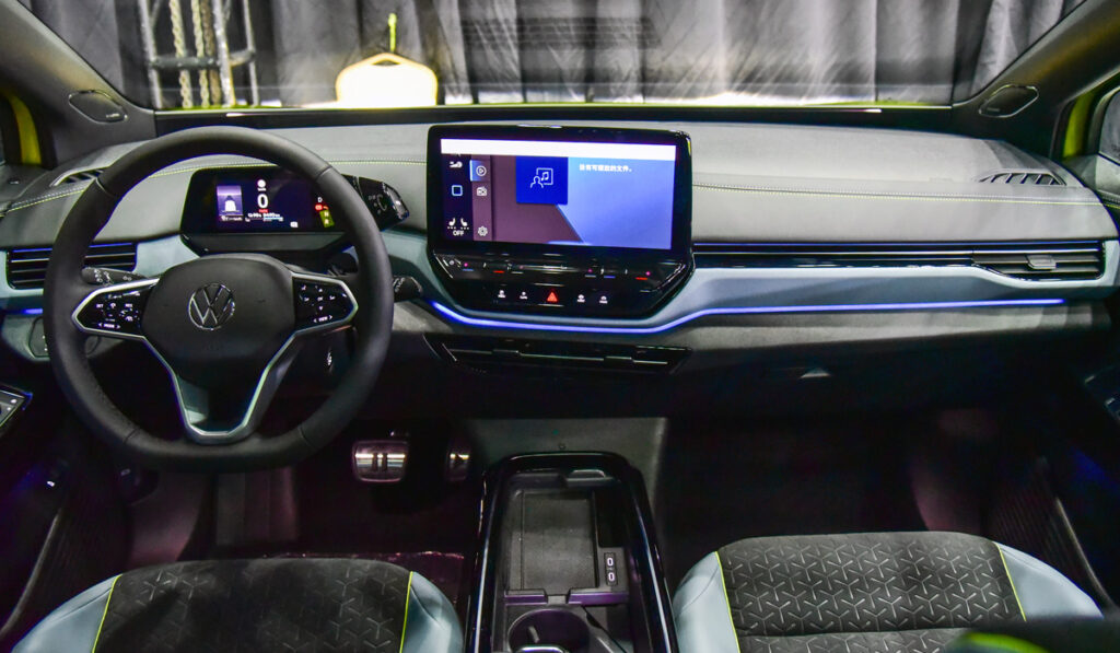 В салоне Volkswagen ID.4 X появилась новая центральная консоль с массивными кнопками управления мультимедийной системой. Технически электромобиль полностью копирует базовую модель.