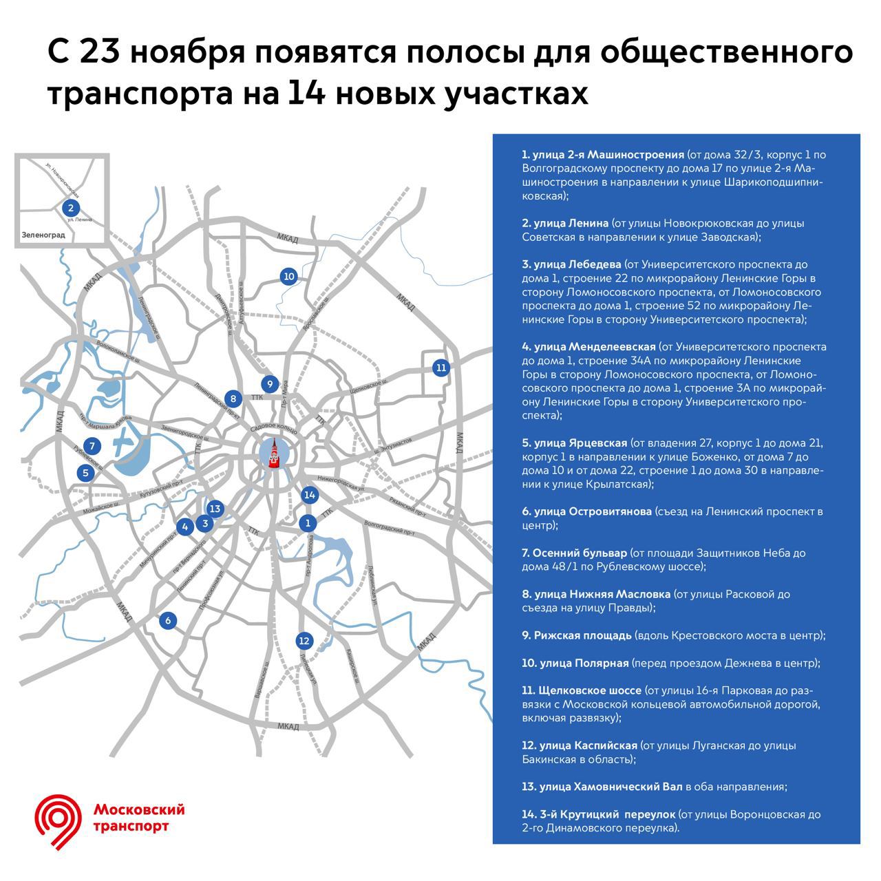 Новые полосы для движения общественного транспорта введут в Москве с 23 ноября. Две из них продолжат уже существующие "выделенки", в ещё 12 - новые. Общая длина этих 14 новых полос — 7,5 км.