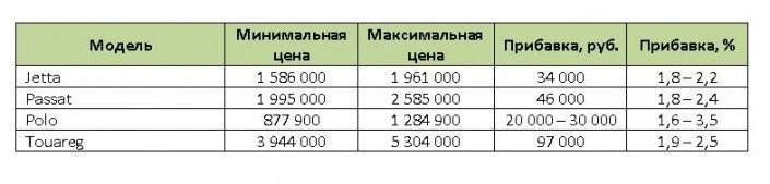 Максимальную прибавку в 97 000 руб. получил кроссовер Volkswagen Touareg. С новыми ценами на автомобили немецкой марки можно ознакомиться в нижеследующей таблице: