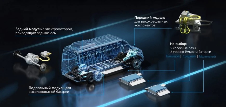 Платформа EVP состоит из 3-х самостоятельных модулей. В переднем расположены блок управления и высоковольтная силовая аппаратура, в центральном — тяговый аккумулятор, а в заднем — электродвигатель. Кроме того, «зелёная» новинка имеет 2 варианта базы и 3 батареи различной ёмкости.