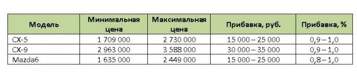Среднеразмерный кроссовер Mazda СX-5 и седан бизнес-класса Mazda 6 во всех комплектациях подорожали на 15 000 — 25 000 руб. Ценники на все версии флагманского паркетника фирмы, Mazda СХ-9, «потяжелели» на 30 000 — 35 000 руб.