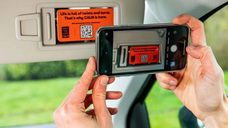 Она называется «SOS» и представляет собой особый QR-код, нанесённый на зеркалf, смонтированнsе с обратной стороны солнцезащитных козырьков. С его помощью можно попасть на сайт CALM и получить там психологическую поддержку.