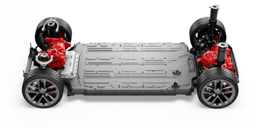 Техническая часть тоже серьёзно модернизирована. 2 двигателя базовой комплектации Long Range форсированы с 564 до 679 л. с., а дальность хода выросла с 647 до 663 км при прежнем аккумуляторе ёмкостью в 100 кВт/ч.
