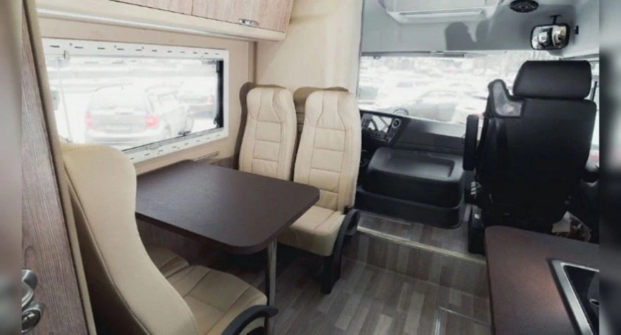 Новый автодом имеет всё необходимое для комфортного проживания в нём в течение длительного времени: в нём имеются вмещающая двух взрослых людей спальня, кухня с маленькой столовой, душевая кабина и шкафы для всего необходимого.