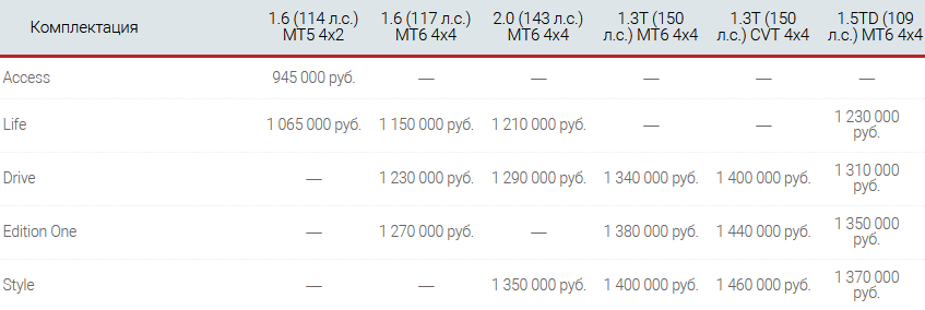 Стоимость нового Renault Duster начинается с отметки в 945 000 руб. Цены на него, по сравнению с предшественником, выросли на 33 000 — 94 000 руб. С ценами на все версии кроссовера можео ознакомиться здесь: