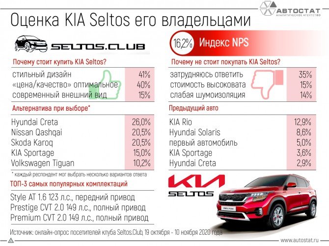Главными же минусами KIA Seltos участники опроса назвали его дороговизну (15% респондентов) и недостаточную шумоизоляцию (14%).