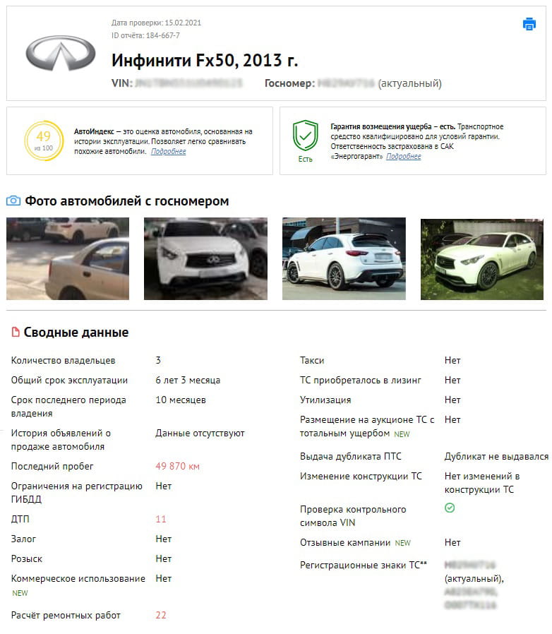 Им стал премиальный кроссовер Infiniti FХ50, сошедший с конвейера в 2013 г. По данным сервиса avtocod.ru, в биографии этого автомобиля, зарегистрированного в Татарстане, за 6 лет и 3 месяца эксплуатации насчитывается 11 аварий и 22 расчёта ремонтных работ.