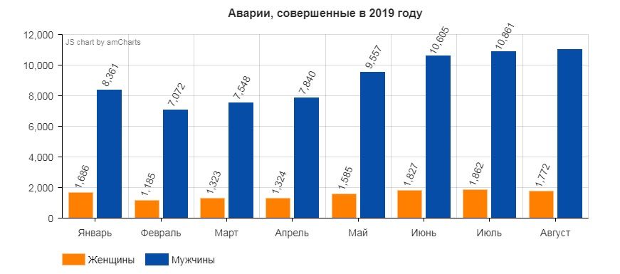 Но, справедливости ради, следует отметить, что никто из респондентов не повторил устойчивый стереотип, гласящий, что женщины совершают аварии намного чаще мужчин. С реальностью это утверждение не имеет ничего общего, доказательством чему служат эти статистические данные: